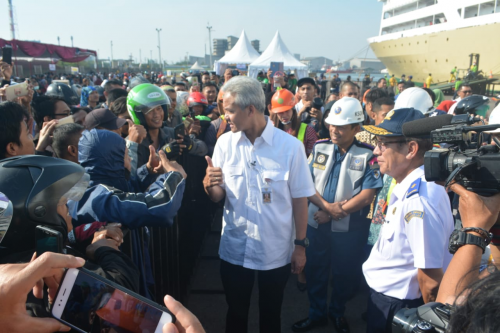 GUBERNUR JATENG SAMBUT RIBUAN PEMUDIK SEPEDA MOTOR DENGAN KAPAL LAUT DI PELABUHAN TANJUNG EMAS SEMARANG