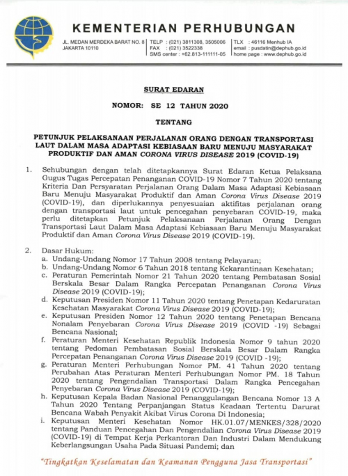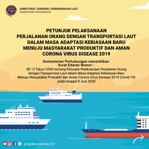JAKARTA (10/6) - Menghadapi masa adaptasi kebiasaan baru dalam bertransportasi termasuk dalam pelayanan transportasi laut, Kementerian Perhubungan menerbitkan aturan tentang Petunjuk Pelaksanaan Perjalanan Orang dengan Transportasi Laut dalam Masa Adaptasi Kebiasaan Baru Menuju Masyarakat Produktif dan Aman Corona Virus Disease 2019 (Covid-19) yang tertuang dalam Surat Edaran Nomor 12 Tahun 2020.