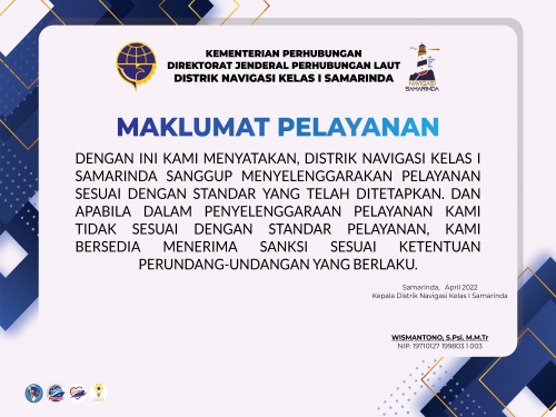 #KawanLaut , Distrik Navigasi Kelas I Samarinda bersamaan dengan terbitnya Maklumat Pelayanan ini menyatakan bahwa Distrik Navigasi Kelas I Samarinda sanggup menyelenggarakan pelayanan sesuai dengan standar yang telah ditetapkan. Dan apabila dalam penyelenggaraan pelayanan kami tidak sesuai dengan standar pelayanan, Kami bersedia MENERIMA SANKSI sesuai ketentuan perundang-undangan yang berlaku