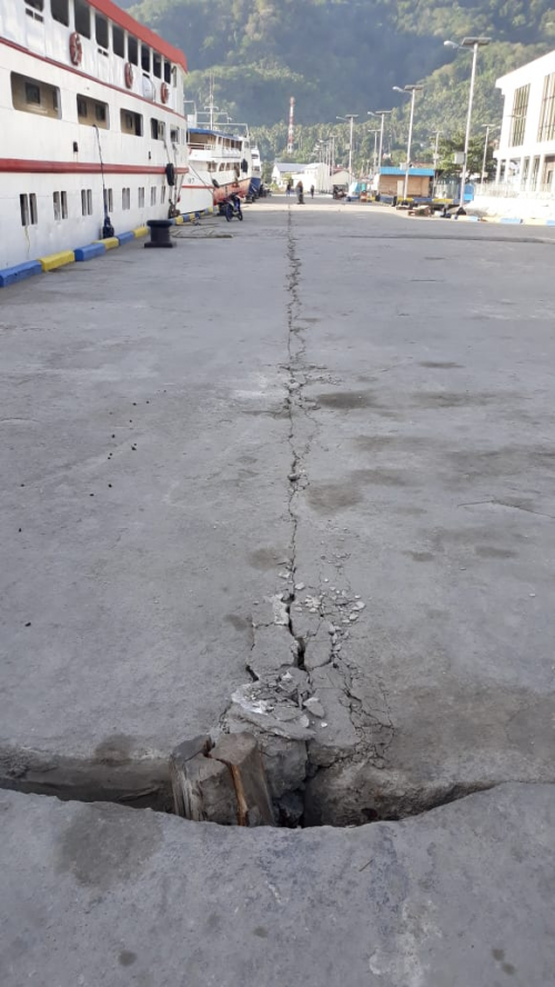 "Gempa terjadi di labuha Maluku Utara kemarin (14/7) pukul 16.10 WIT dan terjadi berulang-ulang sehingga terjadi kerusakan ringan diantaranya terminal penumpang pelabuhan Babang sebagian besar plafonnya rusak, Dermaga pelabuhan Babang retak, Talud pelabuhan Babang retak sehingga tadi malam aktivitas pelayarannya dihentikan," ujar Jufri.