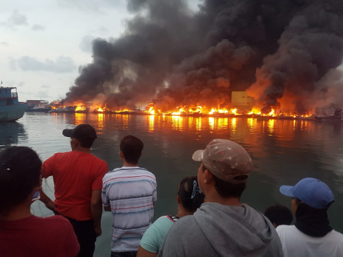 MUARA BARU (23/2) - Sebanyak 16 kapal penangkap ikan atau kapal nelayan yang terbakar di Pelabuhan perikanan Samudera Nizam Zachman, Muara Baru Jakarta Utara sore tadi (23/2) hingga kini masih dalam proses pemadaman. Sejauh ini tidak ditemukan adanya korban jiwa dalam peristiwa kebakaran kapal penangkap ikan tersebut.