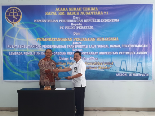 Oleh sebab itu, pada saat yang bersamaan dengan penyerahan kapal KM. Sabuk Nusantara 71 tersebut juga dilakukan acara Penandatanganan Perjanjian Kerjasama antara Pusat Penelitian Pengembangan Transportasi Laut, Sungai, Danau dan Penyeberangan Kementerian Perhubungan dengan Lembaga Penelitian dan Pengabdian Masyarakat Universitas Pattimura Ambon di gedung Pelindo IV di wilayah Pelabuhan Yosudarso Ambon, Maluku.