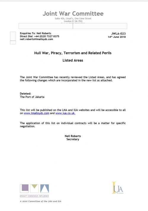 Dalam daftar pelabuhan beresiko perang (war risk) yang dikeluarkan oleh JWC pada tanggal 14 Juni 2018, Pelabuhan Tanjung Priok Jakarta sudah dihapus. Hal ini menunjukan kepercayaan dunia bahwa Indonesia khususnya Pelabuhan Tanjung Priok Jakarta aman.