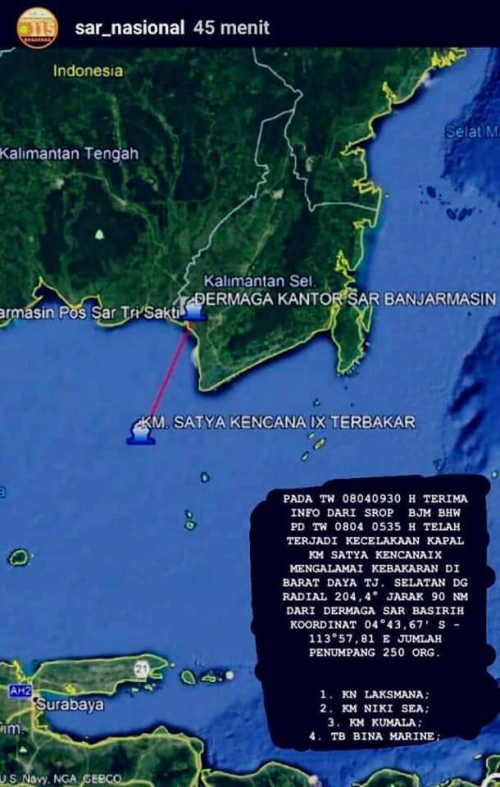 Kapal KM. Satya Kencana IX dengan rute Surabaya menuju Banjarmasin sebelumnya, dilaporkan terbakar pada posisi 04-43.67 LS/ 113-57.81 BT atau sekitar 54 mil Barat Daya Tanjung Selatan Kalimantan Selatan pada hari ini (4/8) pukul  05.35 WITA.