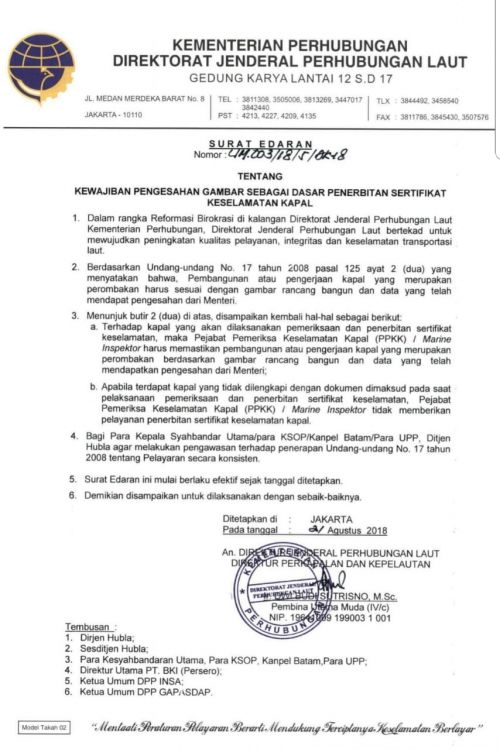 Ketentuan tersebut tertuang dalam Surat Edaran Nomor UM.003/18/5/DK-18 tentang Kewajiban Pengesahan Gambar Sebagai Dasar Penerbitan Sertifikat Keselamatan Kapal yang dikeluarkan pada tanggal 21 Agustus 2018 dan ditandatangani Direktur Perkapalan dan Kepelautan atas nama Dirjen Perhubungan Laut di Jakarta.