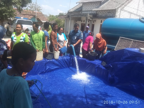 TUBAN (26/10) - Kementerian Perhubungan cq. Ditjen Perhubungan Laut melalui Kantor Unit Penyelenggara Pelabuhan (UPP) Kelas III Brondong memberikan bantuan air bersih untuk para warga Tuban yang terdampak bencana kekeringan yang telah berlangsung lama.