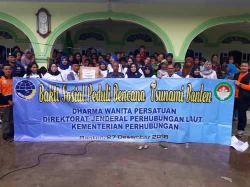 BANTEN (28/12) – Sebagai wujud kepedulian sosial terhadap korban bencana tsunami yang melanda Selat Sunda beberapa waktu lalu, Dharma Wanita Persatuan (DWP) Direktorat Jenderal Perhubungan Laut Kementerian Perhubungan melaksanakan kegiatan Bakti Sosial Peduli Bencana Tsunami Banten bertempat di Pengungsian Kampung Tenjolahang Timur Kecamatan Jiput, Pandeglang, Banten, kemarin (27/12).