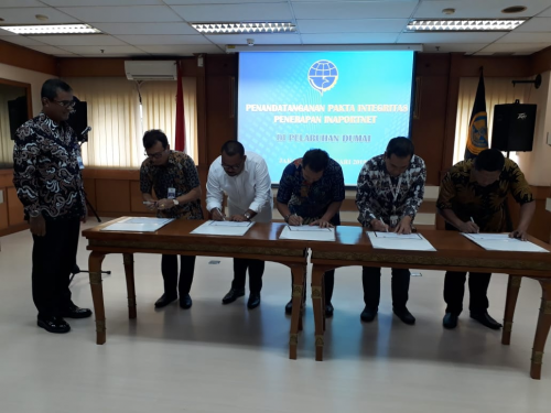"Dan pada hari ini dilaksanakan Penandatanganan Pakta Integritas Penerapan Inaportnet di Pelabuhan Dumai oleh Kepala Kantor KSOP Kelas Dumai, Direktur SDM PT. Pelindo I (persero), Direktur Operasional PT. Pelabuhan Tiga Bersaudara, General Manager PT. Pelabuhan Tiga Bersaudara dan General Manager PT. Pelindo I (Persero) Cabang Dumai," ujar Capt. Wisnu.