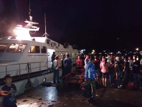 TAHUNA (11/1) - Kementerian Perhubungan cq. Ditjen Perhubungan Laut melalui Unit Penyelenggara Pelabuhan (UPP) kelas II Tahuna mengerahkan kapal patroli KPLP KNP. 343 dari pangkalan Pelabuhan Tahuna untuk mengangkut ratusan pelajar kembali ke Tahuna usai liburan Natal dan Tahun Baru 2019 di berbagai wilayah Sangihe kemarin (10/1).