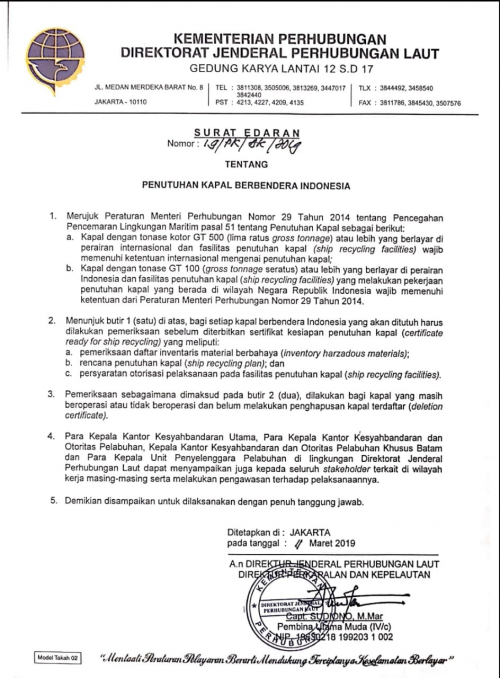 JAKARTA (13/3) – Pemerintah melalui Direktorat Jenderal Perhubungan Laut Kementerian Perhubungan telah menerbitkan berbagai peraturan dan kebijakan yang mengatur tentang pencegahan pencemaran lingkungan maritim, termasuk dalam kegiatan “penutuhan kapal” atau dikenal dengan istilah “ship recycling”.