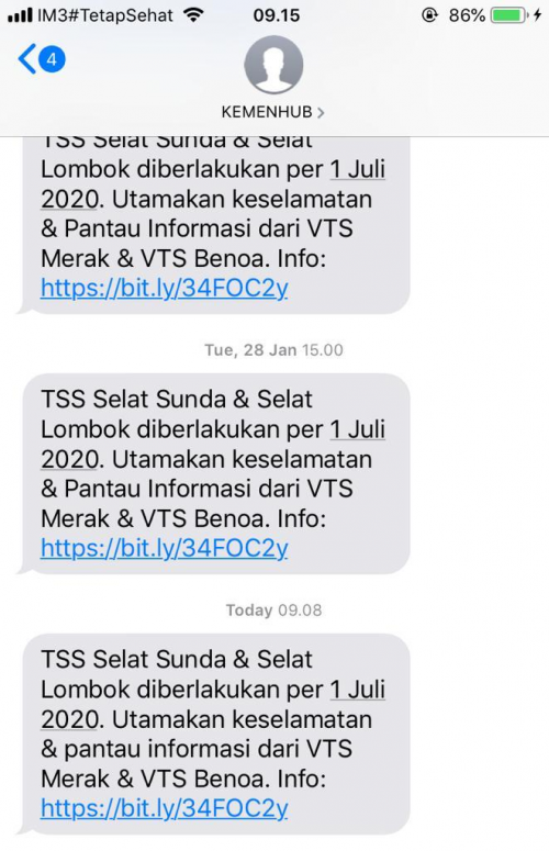 Ia menjelaskan, pengiriman SMS Blast tersebut menggunakan identitas “KEMENHUB” sebagai identitas pengirim dan dikirimkan pada tanggal 30 Juni – 2 Juli 2020.  Pada tahap pertama, tutur Hengki, SMS Broadcast terkait dengan implementasi TSS di Selat Sunda dan Selat Lombok tersebut telah dilaksanakan pada bulan Januari 2020 dan direncanakan penyampaian tahap kedua akan dilaksanakan pada periode 30 Juni s.d. 2 Juli 2020.