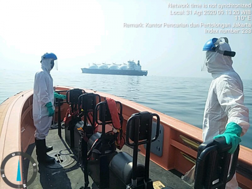 KEMENHUB DAN TIM SATGAS COVID 19 EVAKUASI TANGANI PELAUT SAKIT DI KAPAL LNG CARRIER MT. JUPITER YANG SANDAR DI PELABUHAN TANJUNG PRIOK