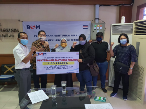 Direktur Perkapalan dan Kepelautan, Capt. Hermanta mengungkapkan, bahwa penyerahan santunan kompensasi kematian senilai USD 215,000 kepada keluarga ahli waris dari keluarga Pelaut yang wafat tersebut dilakukan langsung oleh  Direktur PT. BSM CSC Indonesia, Capt. Akhmad Zubaidi dengan disaksikan oleh perwakilan dari Direktorat Perkapalan dan Kepelautan Ditjen Perhubungan Laut dan juga pihak asuransi.