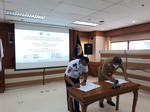JAKARTA (27/10) – Kementerian Perhubungan melalui Direktorat Jenderal Perhubungan Laut secara sermi menandatangani naskah perjanjian hibah dan serah terima Barang Milik Daerah (BMD) antara Pemerintah Kabupaten Bulukumba Provinsi Sulawesi Selatan dengan Direktorat Jenderal Perhubungan Laut pada tanggal 26 Oktober 2020 di Jakarta.
