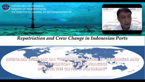 JAKARTA (7/11) - Indonesia diwakili Kementerian Perhubungan c.q Direktorat Jenderal Perhubungan laut telah mengikuti Regional webinar on “Challenges faced by seafarers and identification of best practices during the COVID-19 pandemicin Asia” yang telah dilaksanakan oleh International Maritime Organization (IMO) pada 4-5 November 2020.