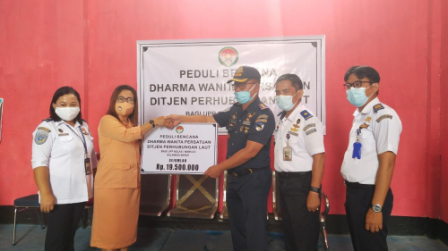 Bantuan yang disalurkan berupa uang tunai yang diserahkan secara simbolis oleh Ketua DWP Ditjen Hubla Suhena Agus kepada Kepala UPP Kelas III Mamuju, Letkol Marinir Gunawan di Kantor Darurat UPP Mamuju, Sulawesi Barat, Selasa (16/2/2021).