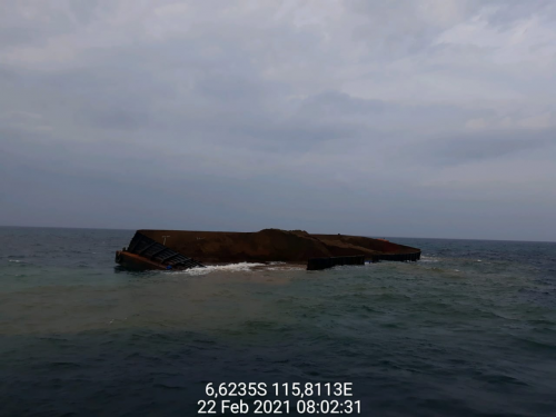 "Akhirnya pada tanggal 20 Februari 2021 jam 17.00 WITA TK. STAR MARINE 3028 kandas di sekitar posisi 06.38.832 S / Bujur 115.48.640 E dan masih berupaya menarik ke kiri (arah timur) agar Tongkang keluar dari kandas, berhubung hari semakin gelap dan laut berombak Jam 18.25 WITA stop penarikan dan Kapal mengelilingi Tongkang untuk melihat kondisi Tongkang, ternyata pintu kanan tengah sudah tidak ada dan dinding kanan bagian belakang sudah roboh ke dalam," paparnya.